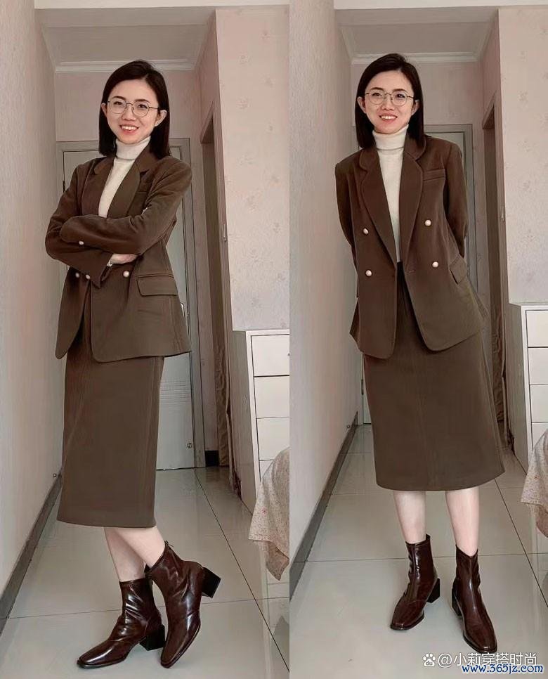 就像这套迷你裙套装相似,同色彩的并置光显给棕色带来了更热烈的视觉格调,突显出熟练谨慎的嗅觉。相宜春季通勤装,让东谈主既议论好气质,又议论气场。