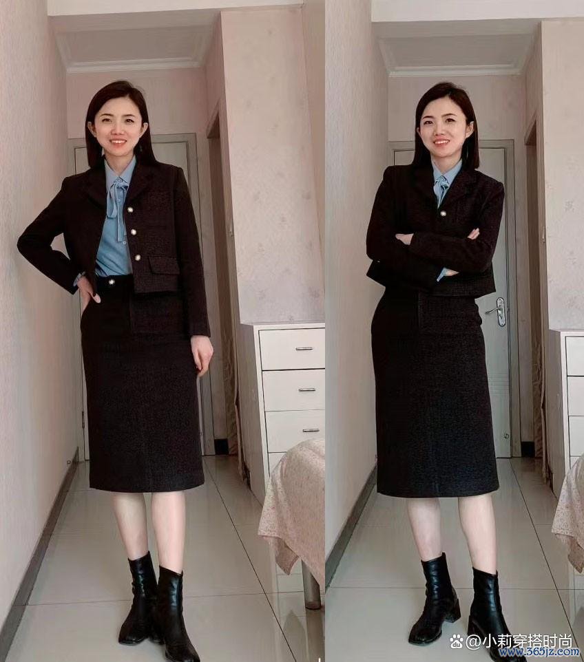 比如上图中的玄色裙子,无论是通勤依然闲静搭配,皆很少会给东谈主带来压力。搭配同色系的小开衫和短靴,很彰着纵向的玄色拼接看起来绝顶通顺天然,完好体现了优雅知性的前卫气质。