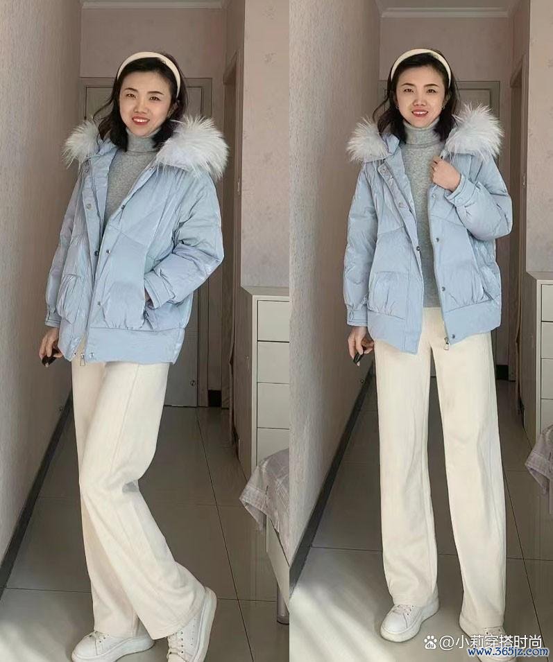 比如图中的浅蓝色羽绒外衣,比拟常见的基础色,视觉偏差比较彰着,但并不是很难驾驭的项目。