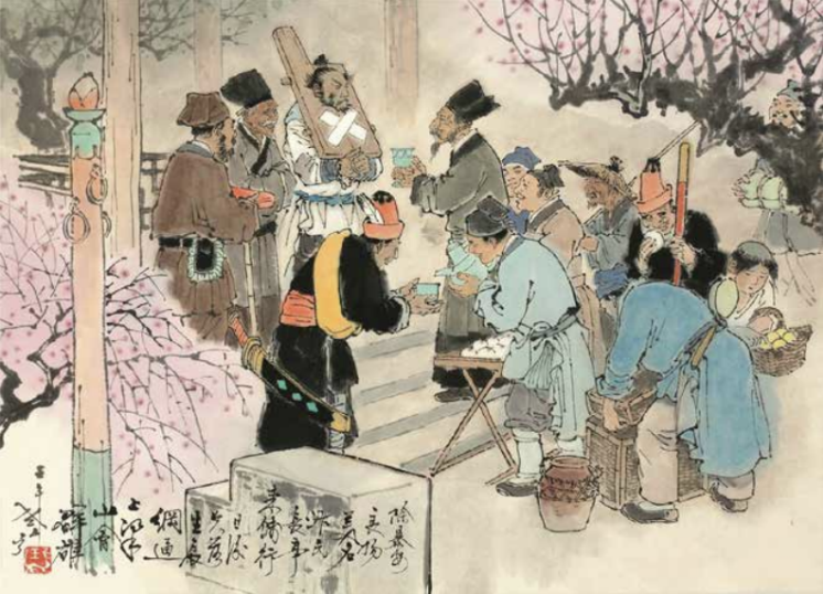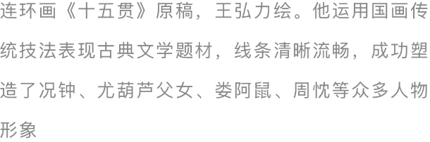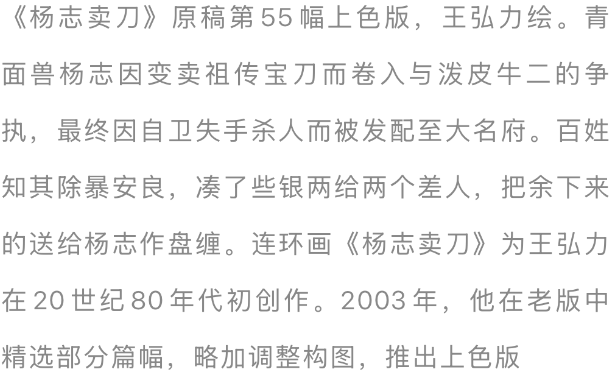 王弘力所绘《十五贯》堪称连环画的翘楚之作。整部连环画只须54幅图,但每一幅构想和构图以及东谈主物形象的形容,都是经过认真探乞降揣摩的:昏黢黑买醉的尤葫芦、单纯苦命的苏戌娟、其貌不扬的凶犯娄阿鼠、朦拢颟顸的巡抚周忱、廉明灵巧的监斩官况钟……每一帧构图都精妙如舞台剧照,每个东谈主物的眉梢眼角、轻而易举都渗入了变装的灵魂。画家沈尧伊曾说:“我把《十五贯》最爱者贴于本中,日习之。全因他笔下东谈主物皆是活的,且随故事情节伸开而幅幅牵动东谈主心。”此外,王弘力在20世纪80年代初创作的水浒故事单册《杨志卖刀》亦是不成多得的连环画佳作。他笔下的杨志,身段精深,衣衫破旧,低眉垂首,将其名满天下的失意和无奈形容得长篇大论。不异,通过紧密的面部细节和身段动作语言,把牛二的恶棍相也展现得点石成金。