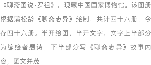 今中国国度博物馆藏有一套《聊斋图说》。遴选木板装帧,绢本设色,画面笔法细腻,色调丽都。图册现有46册(有两册遗失),发扬了《聊斋志异》中418则故事,描画画面725幅,每篇故事绘图页若干不等,少则1页,多至5页。半开绘图,半开笔墨,笔墨上半部分是编绘者题诗,下半部分写《聊斋志异》故事内容,可谓图文并茂,绘制简略,设色雅丽,堪称艺术珍品。这部成书于清光绪年间的《聊斋图说》是由“红顶商东谈主”徐润组织其时名家妙手绘制而成,动作慈禧太后六十大寿贺礼,呈送宫廷,传奇慈禧太后格外心疼。光绪二十六年(1900),八国联军侵华,《聊斋图说》被沙俄戎行掠走,后存于苏联科学院远东分院藏书楼,直到1957年才欢喜璧还给中国。