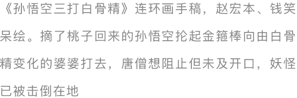 《孙悟空三打白骨精》创作于1962、1963年间,由赵宏本、钱笑呆携手创作。二东谈主经过合理单干,充分确认了各自专长和想象力、创造力。赵宏本主要负责东谈主物造型和构图,钱笑呆主要承担精稿的勾线。两位艺术家的贯通投合,使得《三打白骨精》的连环画创作成为一部不成多得的经典之作。该连环画以极其深湛的笔法将一个痛心疾首、独具只眼、有七十二般变化的孙悟空描画得活天真现,作品充满清闲主义的奇想遐想。画面里奇峰迤逦如怪兽嶙峋,潸潸缭绕似仙气氤氲,将取经之路渲染得胆战心慌。师徒四东谈主的心机更是点石成金:悟空的机灵跳脱、八戒的憨态馋相、沙僧的淳厚赤忱、唐僧的堕落和善,都被描画得生动逼真。这些都成为自后无人不晓的86版电视剧《西纪行》的形象参考样本。