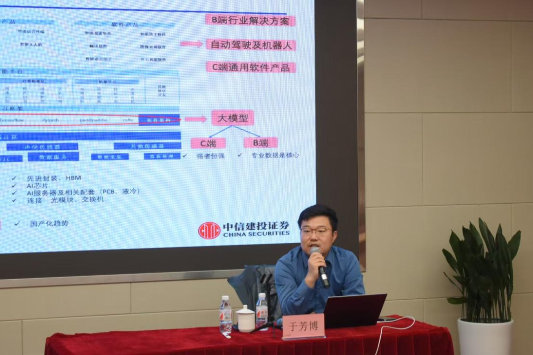来自中信建投证券东说念主工智能行业首席分析师于芳博教师作念《AI的产业应用》专题讲课。于教师系总共享了现时国表里大模子发展现状,并就AI在加快自动驾驶进度、促进东说念主形机器东说念主生意化,以及在金融等规模的场景应用进行了正式先容。